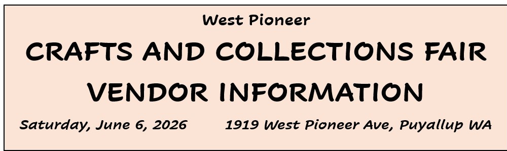 WHERE AND WHEN: The Crafts and Collections Fair will take place Saturday, June 6, 2026, from 9:00 AM to 3:30 PM on the grounds of the Puyallup United Methodist Church at 1919 West Pioneer in Puyallup WA. The Fair will take place in the front parking lot visible from Pioneer Ave. The back parking lot will be reserved for vendor vehicles and will be supervised. Both parking lots are paved. Shopper parking will be available on the west side of the church. There is also on-street parking nearby. This is a one-day event.